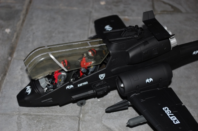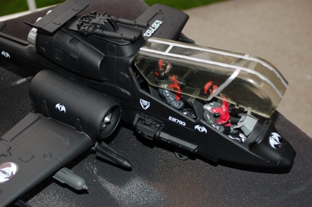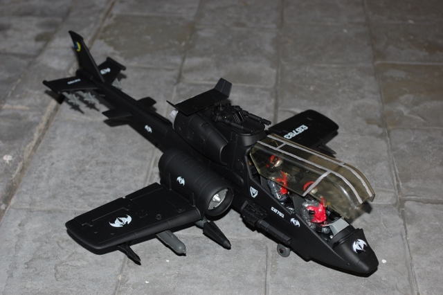 This is an older custom of mine but still one of my favorites. I took a busted Dragon Fly and cut down the tail so it was a bit shorter I also removed the small wing on the one side. Then I used the Dragon Flies small side wings for the tail. I then cut down the metal bar that holds the wings on the Rattler and used that and glue to hold the wings on the Dragon Fly. I added Silver Mirage cannon on either side of the cab and filled the gun hole in the front floor. I also removed the trigger for the blades and covered both sides so they match. It's finished in classic Cobra black with white logos.