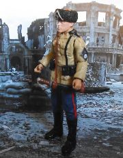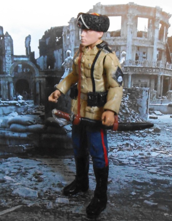 Cossack, von Jungschultz Cossack Regiment, I Panzer Army, XXXX Panzer Corps 1942 - 1943. This figure came from a conversation I was having with a friend who is interested in World War 2 history. We were discussing the direction my customs were taking, and the fact that most toy companies only seem to trot out the same German and American army figures time after time. I started thinking about the auxilliary units that the German amry used, and their allies. I immediately thought of the Cossacks and started to do some research. I found the uniform specifications for this particular look and put the parts together in my head. I went for the RoC Duke head as he has a slightly Eastern European look that I was aiming for.