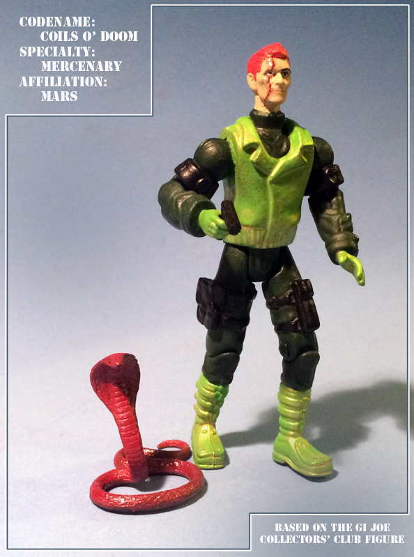 For 2019, the GI Joe Collector's Club last year with licensing rights, it did something fun. It took set names from the 1970's and warped them into new figures/characters. Coils of Doom, a playset, was warped into "Coils O'Doom", a MARS mercenary. He's also implied to be the father of GIJCC figure Crimson Asp, who shares his look/feel and color set.