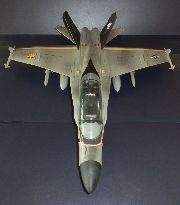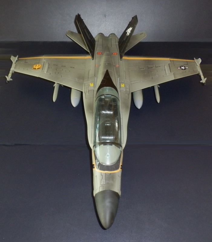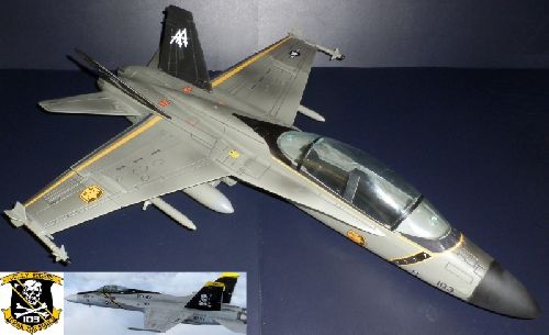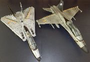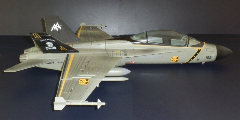 After acquiring the 30th anniversary Skystriker, I wanted a squadron mate for my F-14, and so I finally bought a Power Team Elite F/A 18 Hornet. In order to make the two more closely resemble each other, I painted the tailfins and nose of the Hornet in black, to match the Skystriker. I then applied the yellow and black scheme Skystriker stickers to both jets in similar areas, and after acquiring the Cobrastickers Jolly Rogers stickers, applied them in a similar fashion. The final touch was acquiring RayD workshop Jolly Rogers decals for the tailfins, and panel lining the Hornet with a gray Gundam marker. It is not of course 100% accurate, but is instead a mixed Skystriker/Jolly Rogers homage.