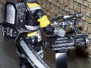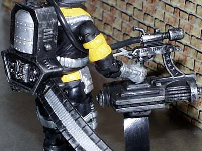 These Cobra android troops are outfitted with a belt-fed, hand-held, dual gatling gun, with laser targeting wired directly into the robot's cpu. They are used to provide suppressive firepower to advancing andriod troops. Unlike the standard B.A.T.s, these guys have the unique ability to distinquish between their fellow artifical lifeforms, and carbon-based beings. This still doesn't alleviate the risk of them harming human Cobra troops on the battlefield, but it cuts back considerable of damage inflicted on costly androids (Especially since their minigun, delivering 5000 rounds-per-minute, would cause substantial damage to advancing ranks).