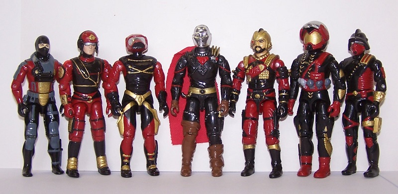 Destro and his Iron Grenadiers sport a very strong colour palette: red, black and gold. This allows for some very striking uniforms for his troops, and complement Destro's v2 outfit well. I have been repainting Destro's forces (Annihilator, TARGAT, Undertow, Voltar, Wild Boar) in order to achieve a more consistent look for them, and figures I should upgrade the basic Iron Grenadier's paint as well. This is mostly to match the card art better -- the padding on the torso is red in the art but black on the figure, the unpainted belt buckle should be gold, and the unpainted belt pouch should be red according to the illustration.