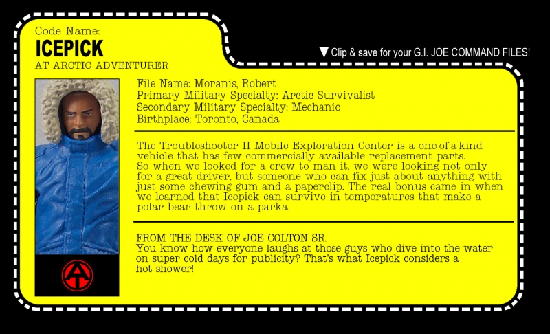 No Adventure Team collection is complete without an Arctic Adventurer. OK, maybe that's not true, but it's certainly fun to have. The recipe is simple as the RoC Snake Eyes body and vest work well for any number of Arctic-themed customs. I tried to change things up with the colors. Rather than going all white, I used blue and tan as a call back to the 1970's ''Fight for Survival'' Adventure Team set.