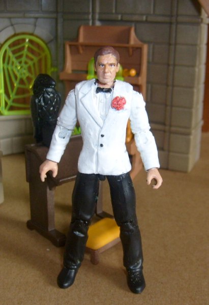 I bought two of the tuxedo torsos from the old Good To Go site last year before it shut down and became Tri-Gate. I had an idea of what to use them for, but never got around to it. I was going through a parts box looking for body parts to make a new series Doctor Who Davros custom, and came across the arms legs and torso that I had put together. Just looking at it, I immediately thought: Club Obi-Wan Indy! I had a spare head from a Crystal Skull Indy. Rather than sculpt a neck, I made a mold of and cast the neck and ball from the KOTCS Indy and used epoxy clay to make it sit in the neck hole on the torso. The head just needed the hair repainted. I lost the hip articulation when I extended the jacket from the waist, but I am still happy with the result. The flower is just a blob of modeling putty striated for the petals.