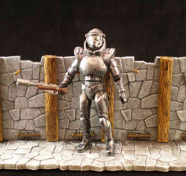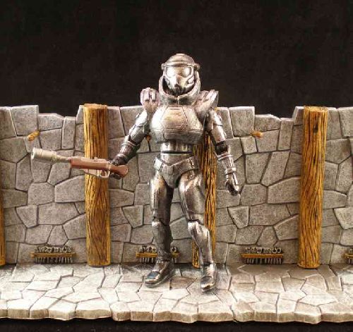 Kainan visited Norway just before 1000A.D. He had traveled on a space ship carrying a huge beast called a Moorwen. With the help of local villagers he trapped, hunted, then killed the last one alive. Obviously this is Kainan in his space flight suit. This was my second time with metallic dry brush. I think it came out ok. I simply could not find a gun that resembled the futuristic one he briefly used, so I just went with a Jawa stun gun.