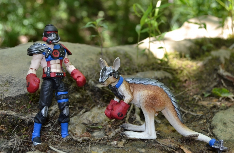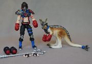 Kangor is another personal favorite character of mine. I had seen HypnoHustler do a version of him complete with a kangaroo wearing boxing gloves and was inspired to create my own version. I wanted to really differentiate him from Big Boa and so chose a unique head cast with the help of Bucky's fodder bin and made a unique webgear from all sorts of stuff from GI Joe to Star Wars to Marvel. Gooru was fun to armor up from a stock kangaroo and I love how they both turned out.
