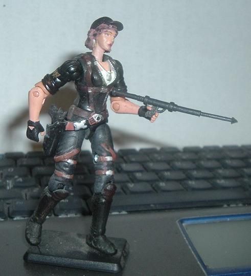 Lady Jaye has been a challenge for most that enjoy making female customs. It's rather hard to make one without totally hacking a head or three apart. I used Bombstrike's head, a Lady Jaye neck, Zarana hair clippings, and Alpine's ball cap. There was a tad bit of epoxy used to fill in some gaps in the hair.