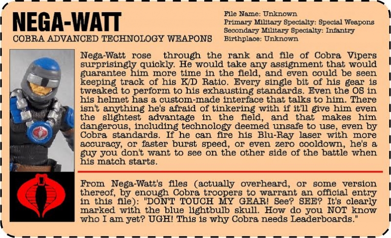 Nega Watt is a creation of Joecustoms member Joemichaels70, who won second place in PHX Custom's Resurgence contest we held at the beginning of the year. The grand prize winner would be featured in Resurgence 2. The results of the contest were so close, I asked Joemichaels if I could do a custom of his Nega Watt figure to include as well. I did a different build than he did, as the head for the original was the same head used on a different character for Resurgence 2. As a nod to Joecustoms.com Red Laser vs. Blue Laser challenge, I included alot of blue, and kitbashed a gun based on the gun that came with the blue laser commander figure he had done.