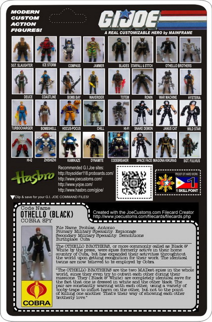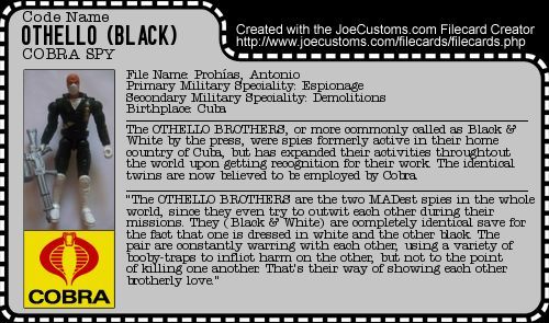 Considering they're Black and White, I chose the name "Othello Brothers" for them, identical twin spies for Cobra.