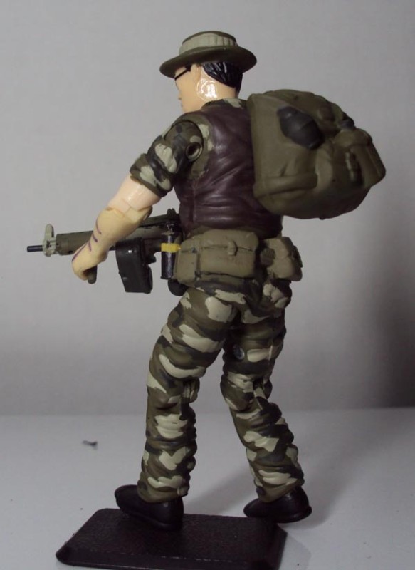 I had a figure left, so I decided it would be better off looking like something less colorful than the original. The uniform was a try to emulate the tiger camo used for the Green Berets in Vietnam.