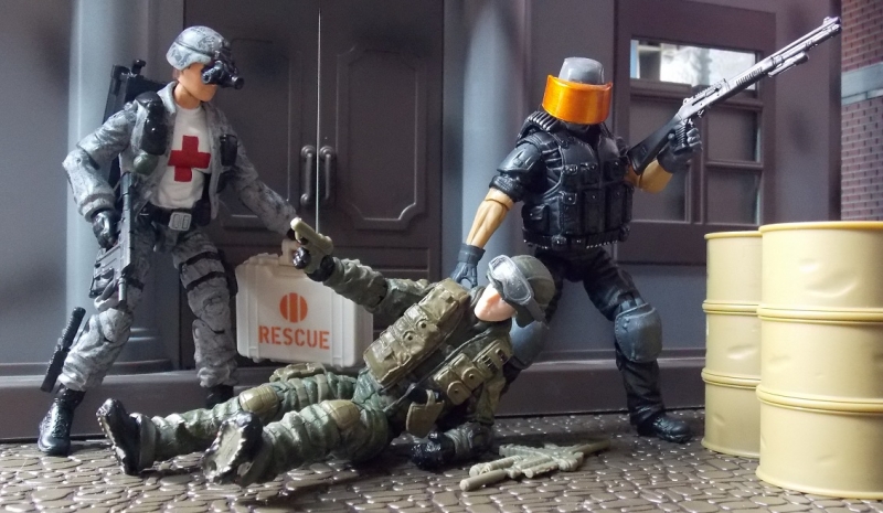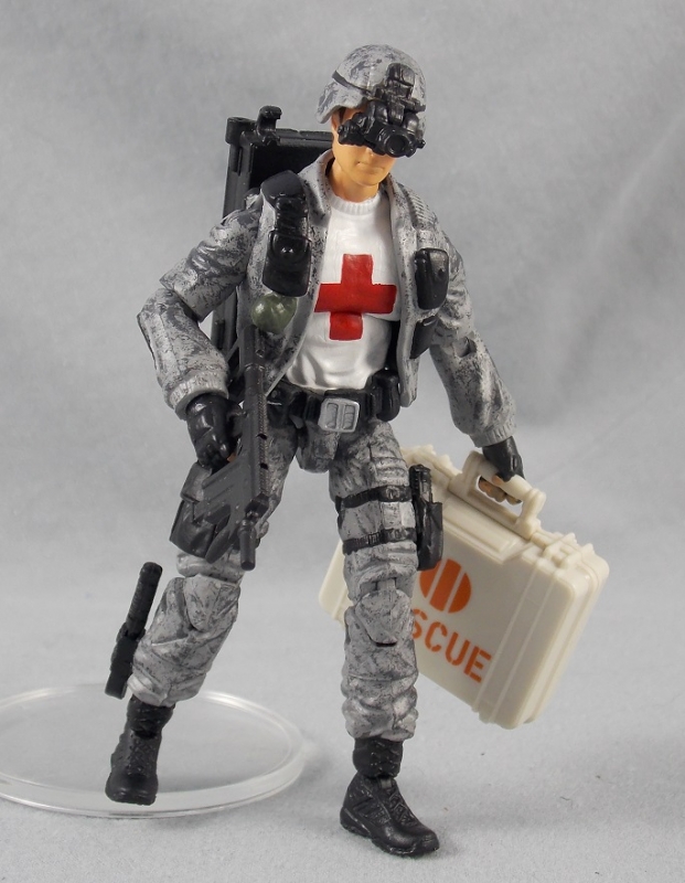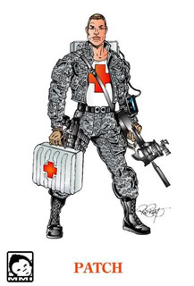 I have had SK Omega characters on my customs radar for a while. I pieced together most of the main cast last year, but never got around to painting and accessorizing them. This project gave me the excuse I needed to get off my behind and get them done. I find it fitting that these characters would be included in a GI Joe toy line as they were created by the fathers of the modern GI Joe mythos. Patch was the character that I was most looking forward to making. I really like the red cross t-shirt with urban camouflage fatigues look of the source material and I tried to be as faithful to it as possible. Thanks to Sam Panico for the filecard.