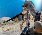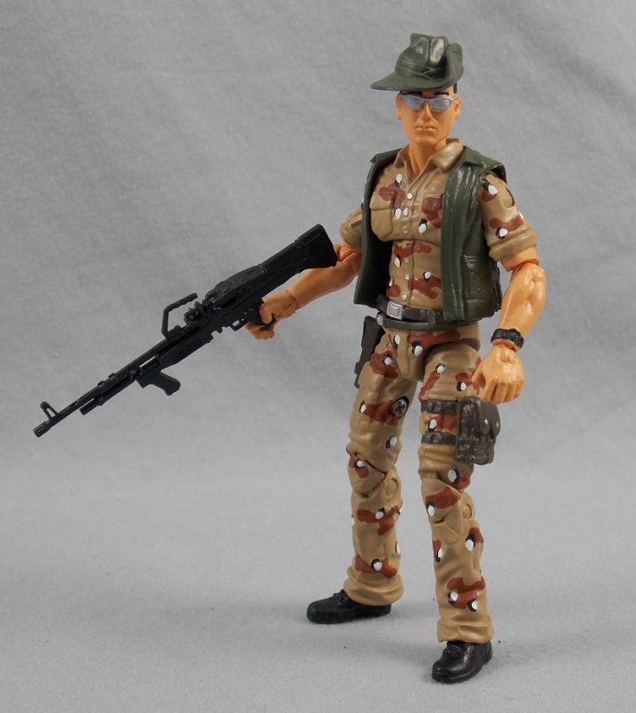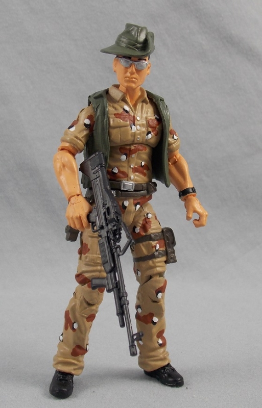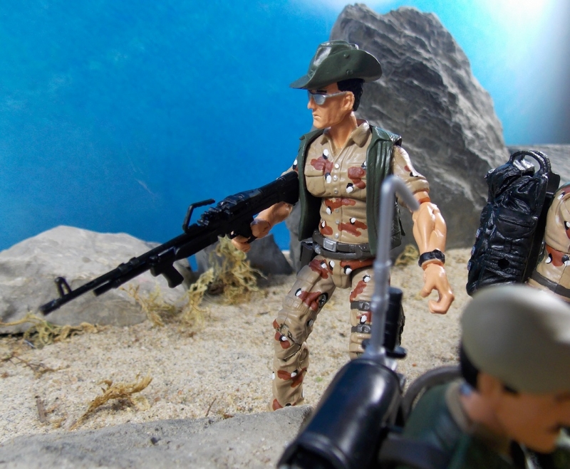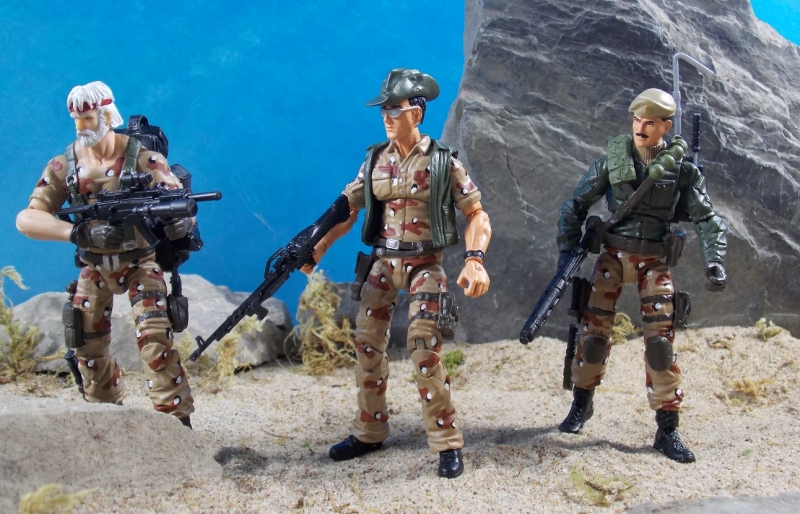 I love flipping through Yojoe's Unproduced Archive and Joe Declassified looking for inspiration. A while back, I found out about 3 prototype figures that were painted in desert chocolate chip camoflage. Outback, Pathfinder and Dial-Tone were to be released with a repaint of the GI Joe HQ around 2000. Since their color pallets already worked with the Desert Patrol Squad's, I decided to adapt them and include them with the team.