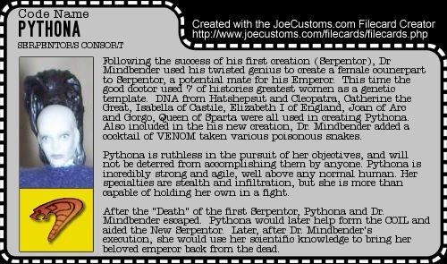 In my Joe Universe, Pythona is a creation of Dr. Mindbender, a female counerpart to Serpentor. Like Serpentor she a genetic hybrid of various DNA.