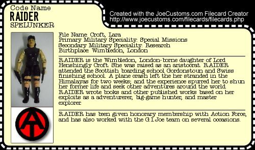Anyway, upon making the filecard, I decided to just base it on Lara Croft, but given she's European, I enlisted her as part of the Action Force, and decided to do away with the "Tomb" in her name, and just stick with "Raider".