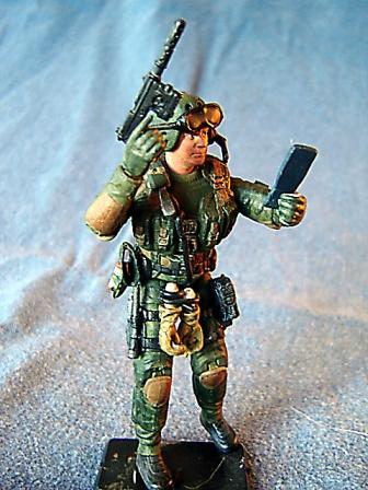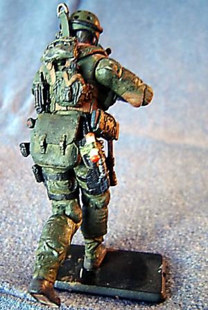 As you can see from the front view, he has an extra pair of gloves for "Fast-roping" out of helocopters straight onto the decks of ships. From the back you can see his radio, canteen, jump kit and on his hip the holster for his palm top computer. You can also see the D-ring for his harness used for extracation from ships via helocopter. They clip into a rope hanging from a chopper and are flown off just hanging from the rope. Quite a site.