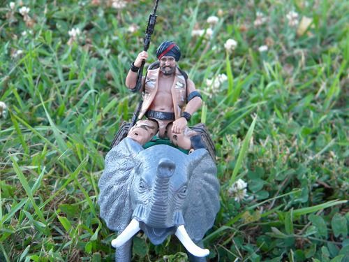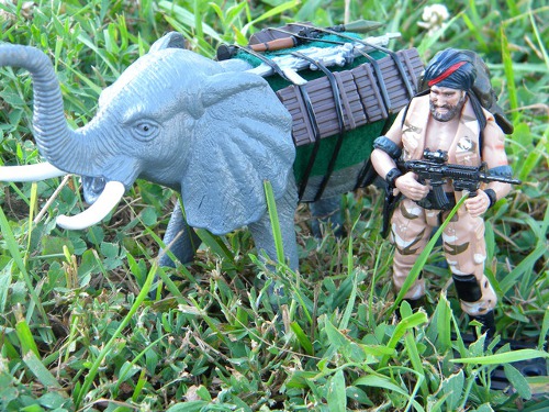 This is now my 5th custom. I had bought an extra Chief Guard on ebay, and was going to use his head as some sort of villain. Unfortunately it was way to large for the figures I wanted to use it on. Plan B was to meld it with a Joe figure, and I found a tutorial on how to combine the 2 styles of bodies. Rather than make him a villain, I decided that diversity was in order, and that what would be more diversified than a Sikh soldier. A little research and viola, Rama was born. I thought he looked lonely, so I bought the elephant as his sidekick and decked him out with gear as well. This one was probably the hardest one I have done so far with trying to get all the pieces to fit together.