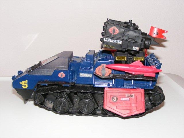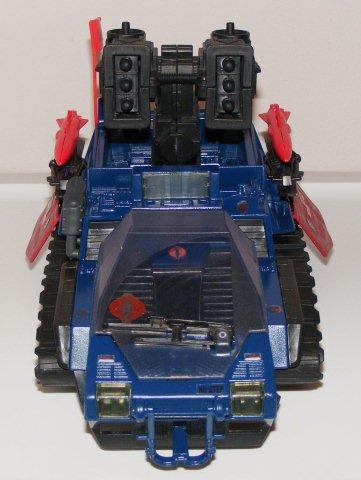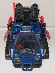 Main Chassis (painted dark, semi-glossy blue) and windshield: 85' Snowcat. Skipedoes: 88' Tiger Cat. MLRS: Sgt. Savage? Skipedo ramps/track shields: 86' Thunder Machine. Exhaust pipes: 88' Swampmasher. Tracks: 88' Warthog. Front bumper bar: 84' Claw. Flag: 86' Stun. Decals: 87' Maggot and various others.