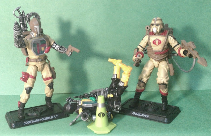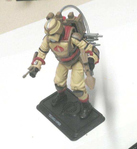 This is my Desert Extreme Techno Viper. He is a part of my Cobra Desert Extreme Squad. His primary function is to fix and repair Cobra's desert vehicles. He has multiple tools/weapons and his new colors help him blend in with his environments.