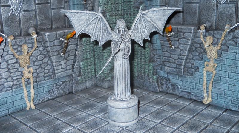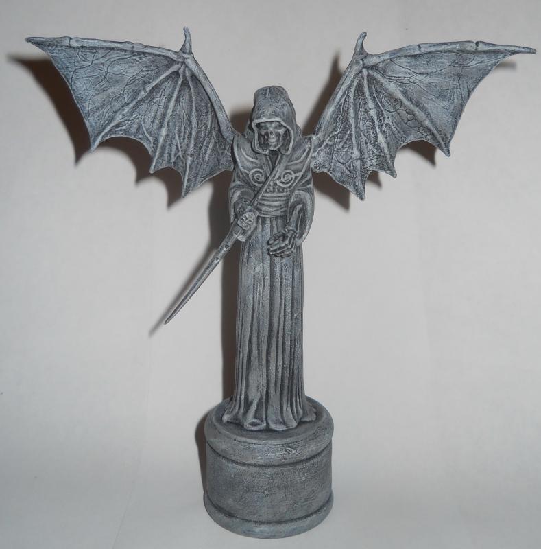 The personification of Death takes on many different forms across many different cultures and eras. This statue represents a darker version than what is normally expected of the Angel Of Death. Gone are the feathered wings, replaced here by membraneous bat wings. The traditional long handled schythe is now integrated into the body of the reaper itself in the form of a prosthetic right forearm for a more terrifying visage.