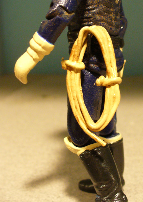 The rope is made from coated wire, looped into shape and then glued to keep the right look. The rope rests on a hook added beneath the gunbelt.