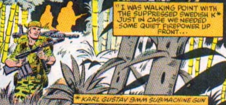 To make a relatively unique head for Wade Collins, I just shaved the moustache off of Footloose. In the book, Collins' main weapon in issue #43 is a suppressed Carl Gustav m/45 submachine gun ("Swedish K"), so that's what he's armed with here.