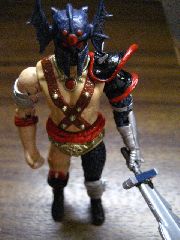 I always like to add unique touches and this time the big change was the chest piece. I would have replicated the original one if I hadn't been stubborn about using Big Boa's ripped chest. Everything has been customized and simple things such as the blue chainmail actually took a really long time. I had to completely sculpt the right forearm since Overkill doesn't have one. The left arm was unfortunately the first piece I customized over a year ago when I wasn't a meticulous sculptor. Finally, the things I like the best, which came out of the December 2003 Dungeon Magazine Cover (the best Warduke ever): the enhanced shoulder pad with spikes, helmet with (slightly modified) bat wing-like ridges and Belt Skull.