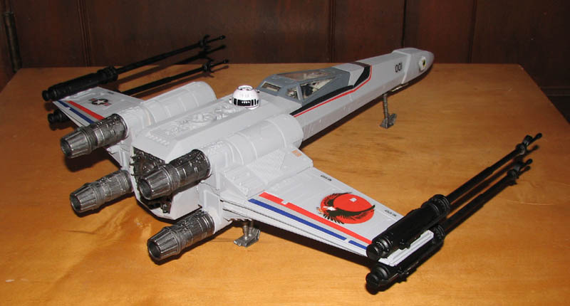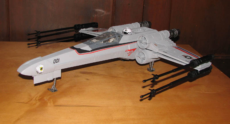 This custom is inspired by Ian's Red 5 Skystriker. I wanted to create its twin in the Star Wars universe. I took the basic unassembled X-Wing and gave it a simple coat of Tamiya primer. I considered painting the ship white to match the original Skystriker but felt the gray better matched the 30th Anniversary version better. The stickers took a little work to fit the less than smooth surface of the X-Wing but with a little cutting and creative placement I think they came out well. Although its not shown, I did place the wing stripes and symbols on both top and bottom of the wings, opposite configuration so they are on the same side when viewed from the top and bottom. And I threw the "Aces High" on the nose as an homage to WWII aircraft nose art.