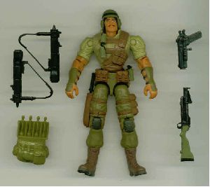Part of my continuing quest to eliminate the T-crotch from my customs, Zap led to a complete re-imagining. While I don't normally care for the non-removable headgear look, for Zap's Hispanic heritage a modified Dart felt right to me... and after I spent an hour and forty minutes hollowing out that Duke head by hand, there was no turning back. I glued on a bunch of grenades and, since he was already sporting a bulked-up look, loaded him for bear with HE weapons. The more I use him, the more I like him.
