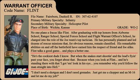 Flint gets no respect. Starting with his filecard in 1985, which labeled his rank as E-6, up to his "legs that go all the way up" version of 2002. His first figure was okay, but had a problem standing with a backpack on. Than a repaint, then the Eco-Warriors debacle, and finally a desert paratrooper that looked more like a gruff old man than one of Joe's greatest leaders.
