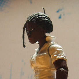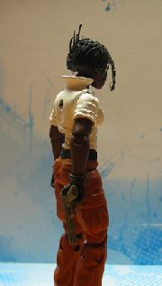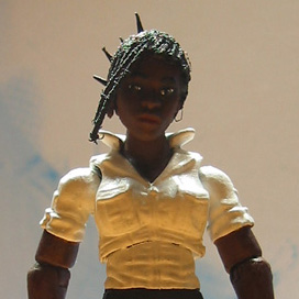 Some construction notes: her hair is kite string, or box twine, cut into strips and super-glued down, then I cut small triangles out of a plastic-coated playing card, and made those into the hair 'spines.' I wish I had put a thin layer of greenstuff down to press the strings into, and possibly a little bit of green to stick all the card pieces into -- they are seeming awful fragile! I started putting this piece together before I had any extra ice-vipers, which is what I'd use for her pants if I were re-doing her -... there's a little too much daylight going on with her thighs...