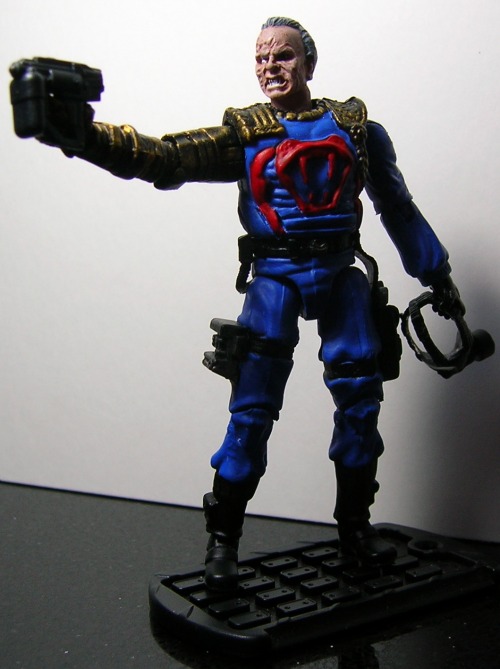 I chose to construct this figure using old and new G.I.Joe parts. I had to resculpt a lot of the lower torso but I think the figure looks quite good if a little on the fat side.I chose blue instead of Cesspool's classic colours as I wanted the figure to fit into my idea of what a cobra officer would wear.