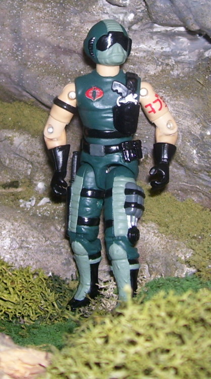 This is my second custom of Copperhead. One thing that I wanted to change was the color selection for his uniform. The original colors were too dark to make out a lot of the details. I opted to go with a light green to replace some of the dark grey and blue. I also decided that I wanted the figure to have removable knife and pistol. I opted for a revolver and an over-sized Bowie type of knife. I also thought it would be cool to give him a pointless leather strap on his upper arm like the original. I also wanted to hint at his past, so I decided to write Cobra in Japanese on his left upper arm as a tattoo, to represent his time in Japan racing speed boats. I also attempted to hint at his southern roots by using the Cross Country middle piece, but I was unable to get the proper look for the Confederate Flag on the buckle.