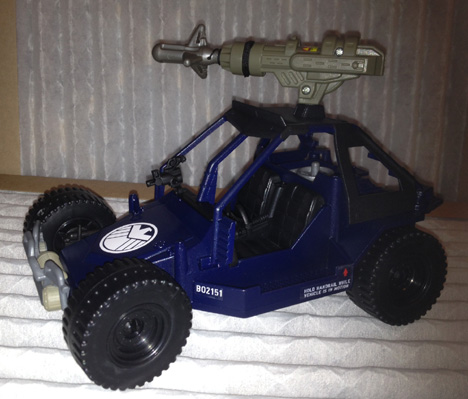 This project was actually a test-shot for a different, upcoming custom project. The easy part of this custom was finding a 25th/Retaliation Ninja Commando (AWE Striker) on clearance, and painting it blue. The interesting part came after that - the use of a cut vinyl decal for the SHIELD logo. These decals are made by a specialty shop from a Vector-based logo that I supplied. The logo was cut from vinyl sheet goods (sticky side down) with the negative space parts still intact, transferred to a tacky sheet of film, had the unwanted parts of the logo trimmed away - a painstaking process called 'weeding' in the industry. The logo was then placed on the vehicle and taped into place with a piece of tape down the center. Half of the logo was peeled back, and the backing removed. Then that half is placed down carefully, using a squeegee to remove air bubbles as I went. Then you repeat for the other side. Finally, the tacky top sheet is removed carefully, as to not dislodge any of the very small pieces of logo. It's an involved process, but the end results are amazingly crisp and worth the effort.