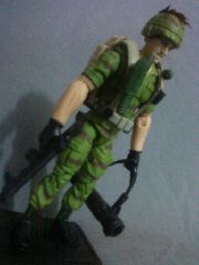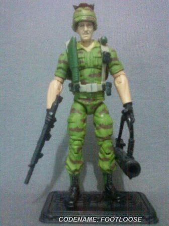I used the same parts and accessories for this re-customized Footloose. The helmet is still from Bazooka, I just added the leaves on top. I only replaced the back pack. The current back pack now is from 7-pack Outback. The body paint for this Footloose re-do is a lighter green. I replaced the camo as well, from circular brown blots to long brown stripes. I hope I did well in making this new custom figure version of Footloose closer to what he should look like.