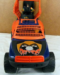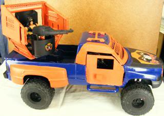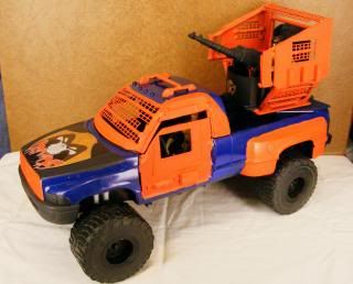 Picked up this great truck that was Joe scale at the thrift store but it had both doors busted off. So decided to armor the door areas, at the time of making this one I was not adding hinges to my customs much so rather then making working doors I opted to make the top lift off so you could put figures in it The gun nest on back I ad actually made for a different project but it was too big for its intended use but it just happened to fit on the back of this truck perfectly and made for a nice finish.
