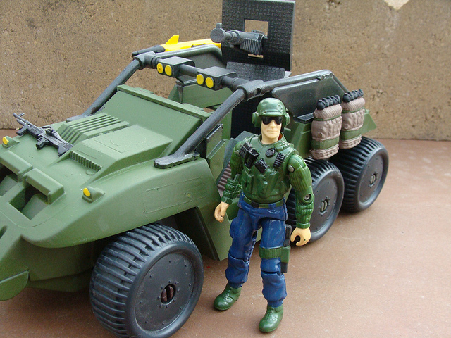 The original Desert Fox had been repurposed for Hasbro's Dino Hunters team, so when putting my Dino Hunters team together this vehicle was a musthave. I had a spare Desert Fox, which was missing a missile tab on the side. I added a couple of spare Budo backpacks to the side to take up that "dead" space, and also mounted a machine gun on the hood.