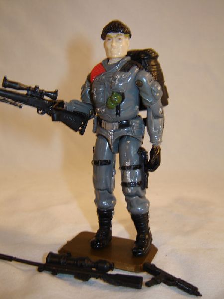 I always just wanted a Low Light that you could remove the goggles on. What I did, I made a push mold of Low Light's hat in some Sculpy3, then wrapped Maverick's head in Sculpy, and shoved it into the mold, then tripped the excess. Then I got some hands from a 21st Century WW2 soldier who had a hand angled for a rifle and added them to Low Light. This was my first try at adding swivel wrists. It was a fair attempt, though I know I could do better today.