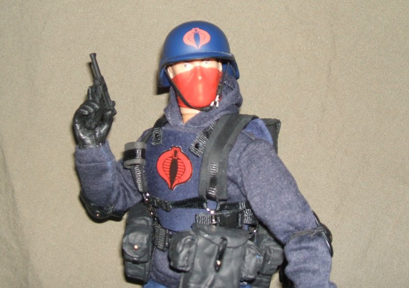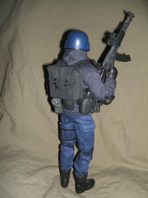 This trooper is a lot like my other custom "Belltoll" but with an AK47 and related pouches. I have developed my own technique for making 1/6th scale packs and web gear and I've not seen anyone else do it like I do. I can't sew worth a darn so I learned to 'craft' gear. For example, for this backpack, I cut a piece of packing foam with a hobby hot knife making a shape for the contents of the pack. Then I used black fabric; cut, folded and glued on to the form in the same pattern as a sewn item. I figure, I'm not going to need the pack to be functional anyway, so why not glue the whole thing together? For the finished edge of the pack flap, I simply glued on strip of the finished edge cut from the same black bandana (hobby store purchase) I used for the fabric. Faux closure straps were made from grosgrain and spare buckles with shoulder straps from grosgrain over folded and glued fabric shoulder pads. Harness details were made using jewelry rings and clips with functional buckles added where necessary. This is a useful method for me for making my own custom gear. It would never stand up to backyard battlefields, but it has managed a long lifespan on my display shelves. I hope other figure customizers will give it a try, particularly when you just can't find the right piece. I'd love to see your results. Have fun!