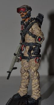 This version of Hit & Run is meant to represent him in a modern desert setup. He would no doubt need desert attire to operate in this day and age, in addition to his usual jungle setup. I tried to keep him light and agile as he is a quick strike type of guy. He has been given a laser target designator to be able to call in airstrikes by Skystrikers or Conquests. Some dry-brushing points out the details and gives him a dusty/desert feel.