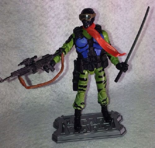 Flash forward to Custom Celebration 8 and bucky presented the Way back Wednesday Challenge to redo an existing custom. Since I was going to do an LBC as an example for that Challenge I decided to hit two birds with one stone. I remade Cool Kid using modern parts, but to keep with my original skills, it had to remain a parts swapped only figure. Gone was the Wild Weasel torso without an ascot anyway. Hit n Run's body gave the bright green and camoed look and switching the red scarf for blue on the vest kept the original color palette in play. Topped him off with a modern Hoth Rebel Trooper rifle (to replace the vintage rifle), sword, goggles and done.