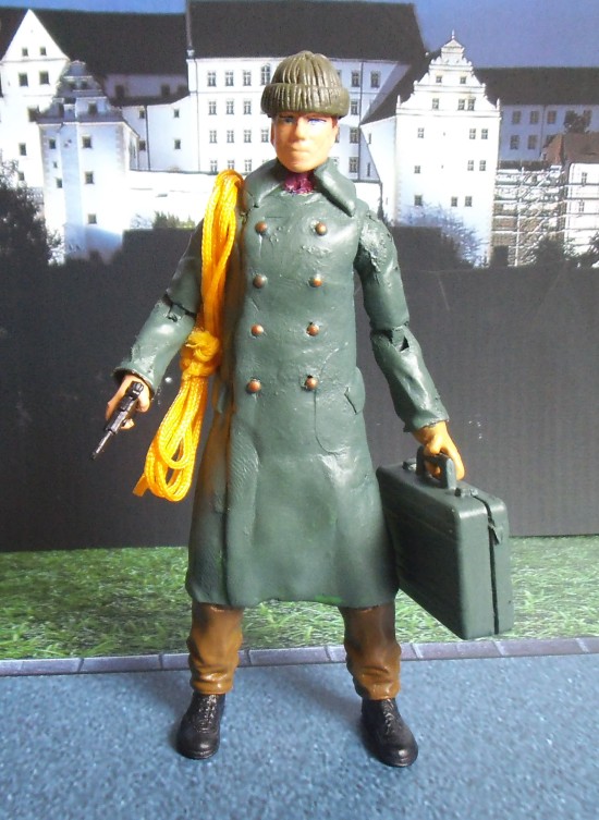 The British POW/Escape Officer Action Man outfit was only available in the box set 'Escape from Colditz' It comprised of a greatcoat, woolly hat, officer's cap, trousers, boots and escape kit. It was easier to create two different heads than try to find one that I could fit both the cap and a MU knitted hat onto. I glued the accessories into the briefcase as I had a spare Luger and torch. I went through several ideas for the greatcoat, but settled on sculpting it and painting it in a German uniform grey/green, as the POWs in Colditz would have been making escape clothes from available materials.