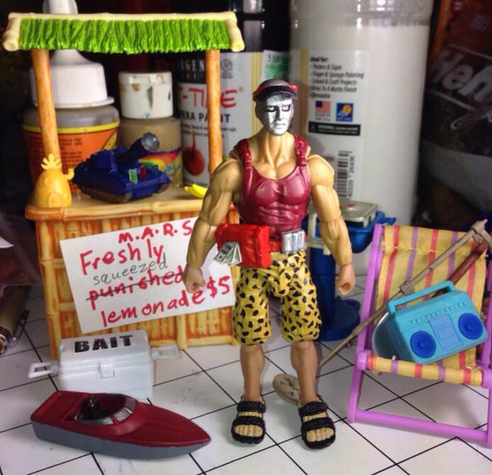 This figure was made for the Beach Blanket Ka-Blammo mini diorama we had at the JoeCustoms table during the 2014 Joe Con in Dallas. A bunch of us saw a speedo wearing Destro on ebay and decided to make our own versions of Cobra at the beach. Since Destro is a businessman first and foremost I figured even on vacation he'd be trying to earn a buck. I included the initial sketch here because of how close the final custom mimics that initial design.