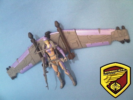 I first used this as a glider of Windbreaker, a comical G.I. Joe concept figure custom I did last year. When we launched G.I. Joe Reloaded last September, I wanted to have a female glider for the project. I created one and called her Blitzwing. Blitzwing is G.I. Joe Reloaded's reconnaissance specialist. Her uniform's colors were inspired by the Decepticon Blitwing. I gave the glider the same color scheme. Luckily the 3.75" base figure I used for Blitzwing has a back pack hole and the glider peg fits perfectly.