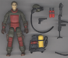 Blowtorch was a tough figure to remake. The original was a favorite of mine as a kid, but as I got older, I had less and less use for him. I wasn't too impressed by the new-sculpt Blowtorch. I went through several different parts combinations before I settled on this one; I like the matching pads on the different body parts. I went with a green thermal suit because I just couldn't imagine him going out in the field in that yellow eyesore. He looks pretty cool suited-up: the oxygen tanks fit on the hook on the waist, and the mask hose connects to them. I'll try to get a pic of him with his gear on. I had a tough time with this figure, but I like the result.