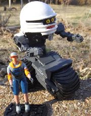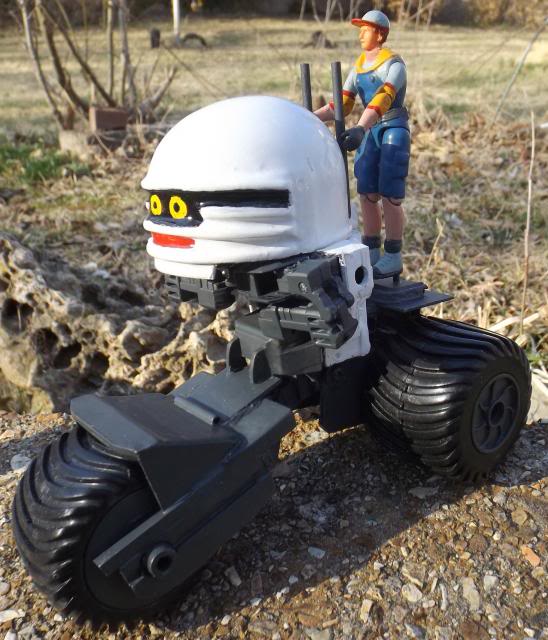 I have been working on MASK vehicles in the world where MASK is a division of GI Joe. This was inspired when Bloodbrigade made a scooter based off of the Trouble Bubble. I saw the scooter and it immediately dawned on me that if you added the dome it was perfect for a large update of the classic MASK T-Bob scooter robot. The wheels are a little bigger then I had originally envisioned but they were just too perfect in every other way.