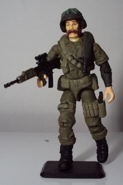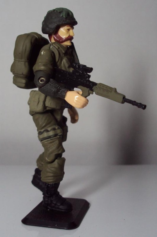 I look at Ambush and I see a british commando from WWII. So this custom is a figure from WWII. The assault rifle is a modern SA-85A1 from marauder inc. The knife is from a Chinese bootleg an the pistol is a Sig Sauer marauder inc. The backpack is a accessory pack Airborne that is very similar to the ranger's backpack f used in D Day. The color scheme is WWII, including the sleeves Fleece Sweatshirt under the uniform. The helmet is from Footloose v1.