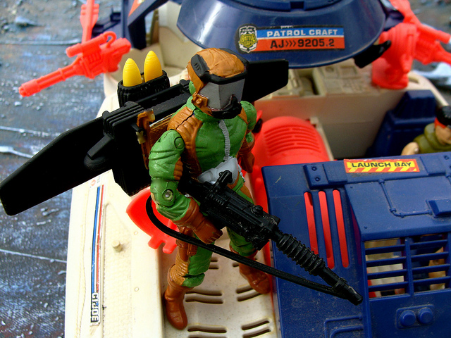 The jetpack is a Metal Head backpack with wings from a Stealth Fighter missile and a Metal Head thigh mounted rocket launcher.
