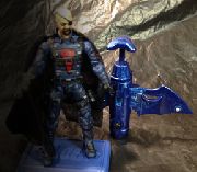 I knew when I gave my Blue Laser Commander a Batman cape that he would need a sweet ride to fly around the battlefield on, just to have the cape billow out behind him. Luckily I had just the thing - an old Spiderman Green Goblin Glider (with spring-loaded goblin face.) I happened to have some glitter blue spray paint and just hit it with that. It looked pretty cool, so I decided to use the same paint on the Batman parts that I outfitted my Battle Armor BLC with. Go Blue Lasers.