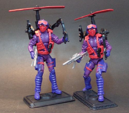 Battle Copters were one of the many gimmicks that Hasbro attempted in the 1990s to revive the Joe brand. The concept was simple: Attach a figure to a helicopter backpack, pull on the ripcord and watch the whole thing take off. As a figure, Heli-Viper was a Franken-Joe. That is, it had no new parts. Its head was taken from the 1985 Snow Serpent and his body is from 1989 Night-Viper. The colors are where the train falls off the tracks: 2 shades of purple and bright reddish orange. A bit hard on the eyes.