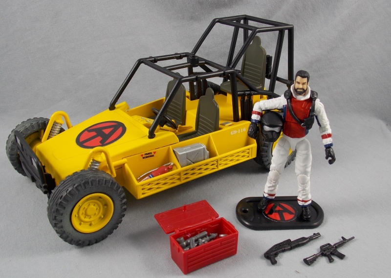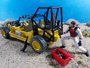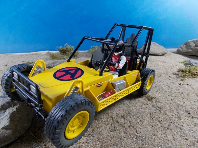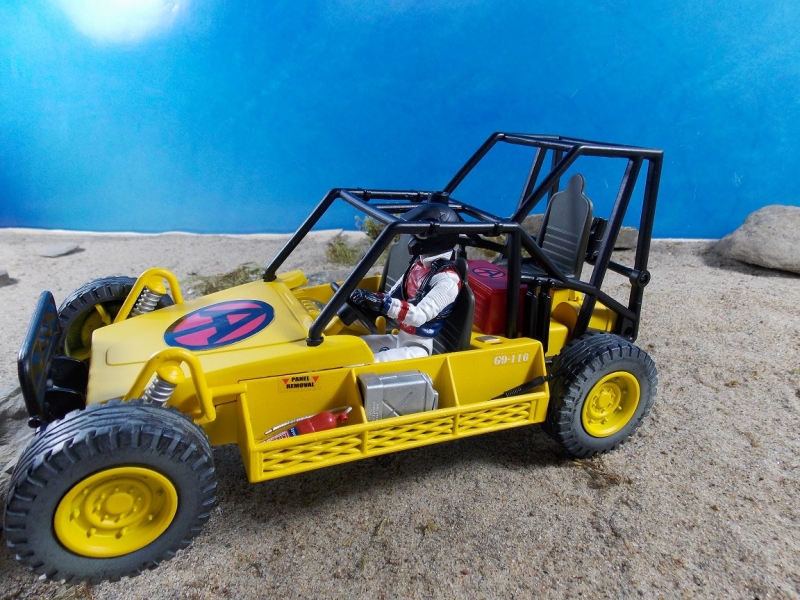 At first I was going to simply make the stunt driver and call him Evel Knievel, but the project grew when I found a spare PTE dune buggy in my boxes. I decided to create a new character that had a famous daredevil father and that joins Joe Colton's new Adventure Team (drbindy's verse) as a stunt driver. I'm pretty happy with the result and I hope that Bindy is enjoying as well.